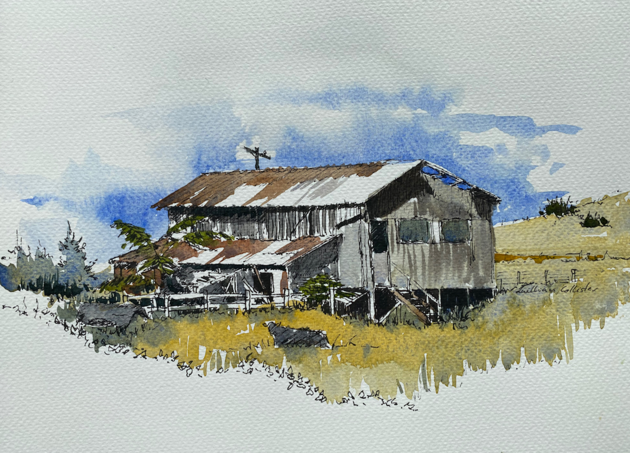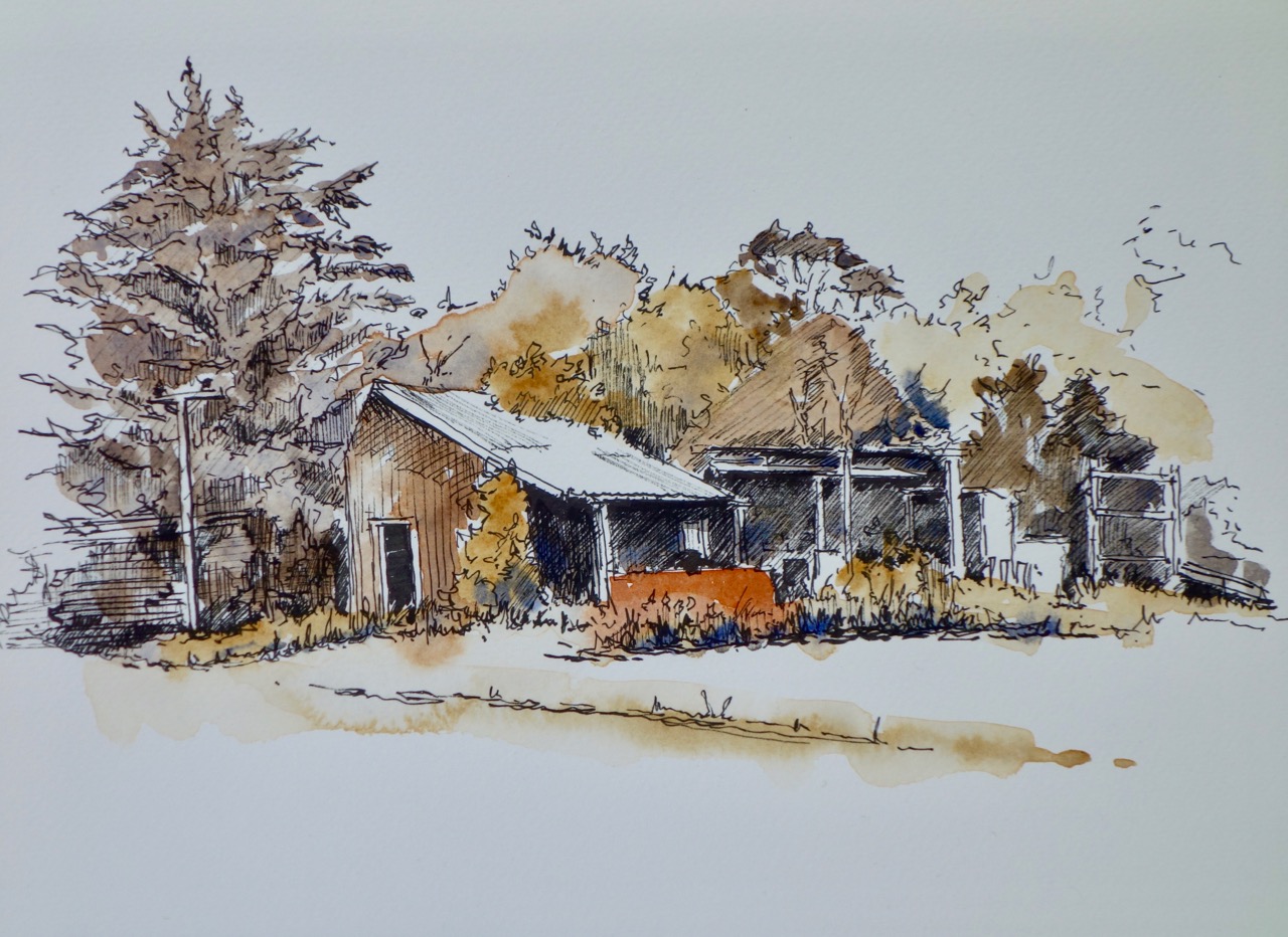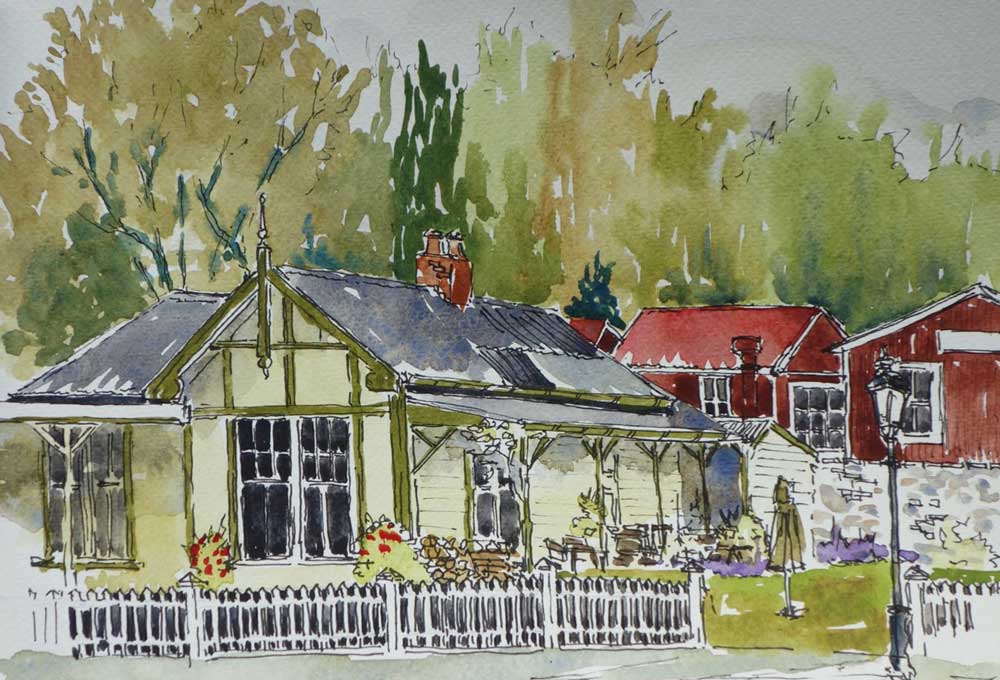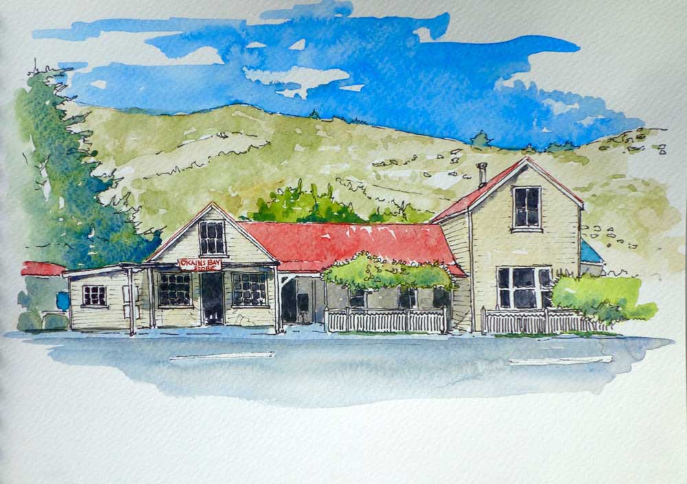 Okains Bay Store, an example of a fairly simple line and wash work. Not far from colouring in.