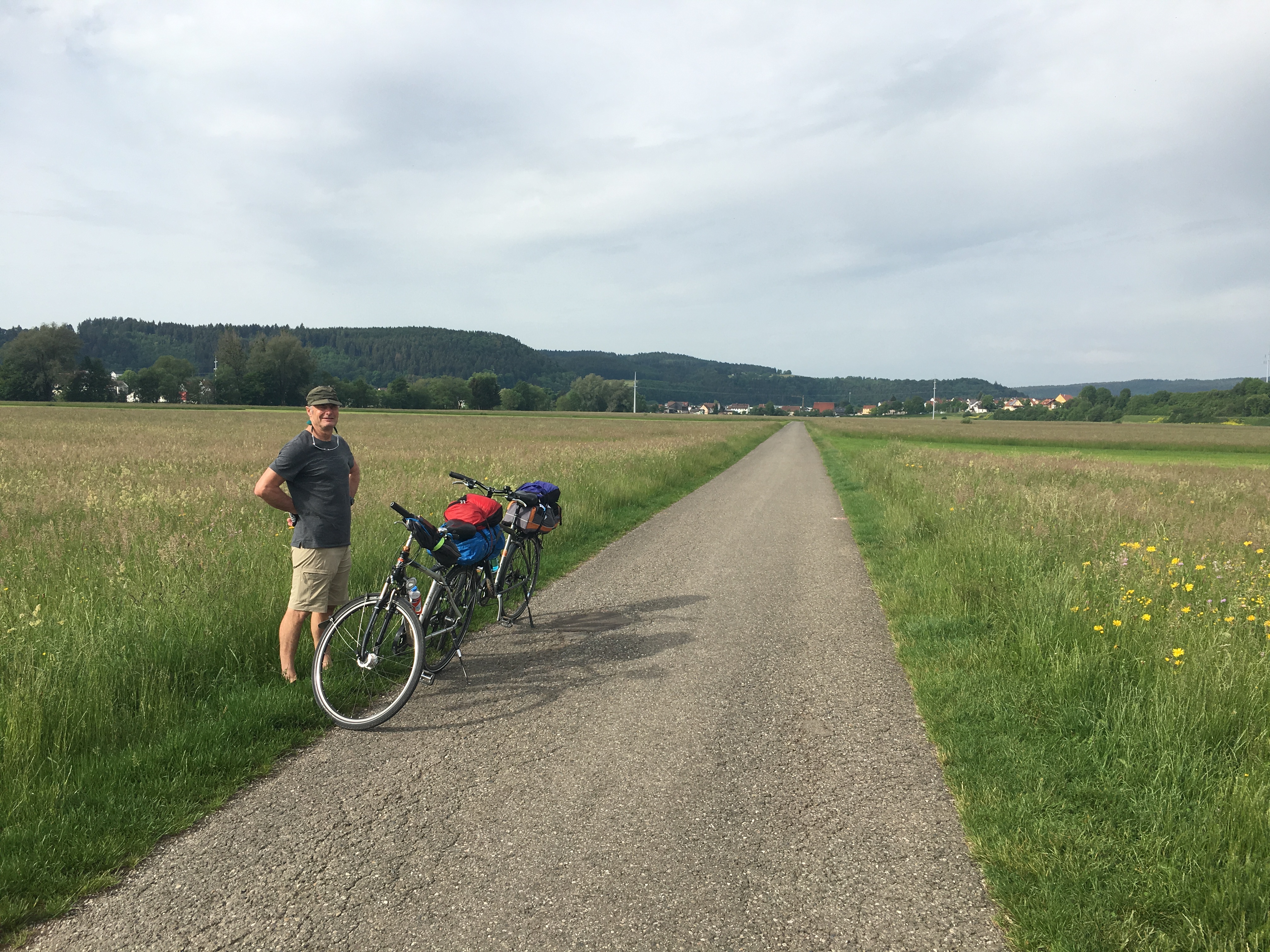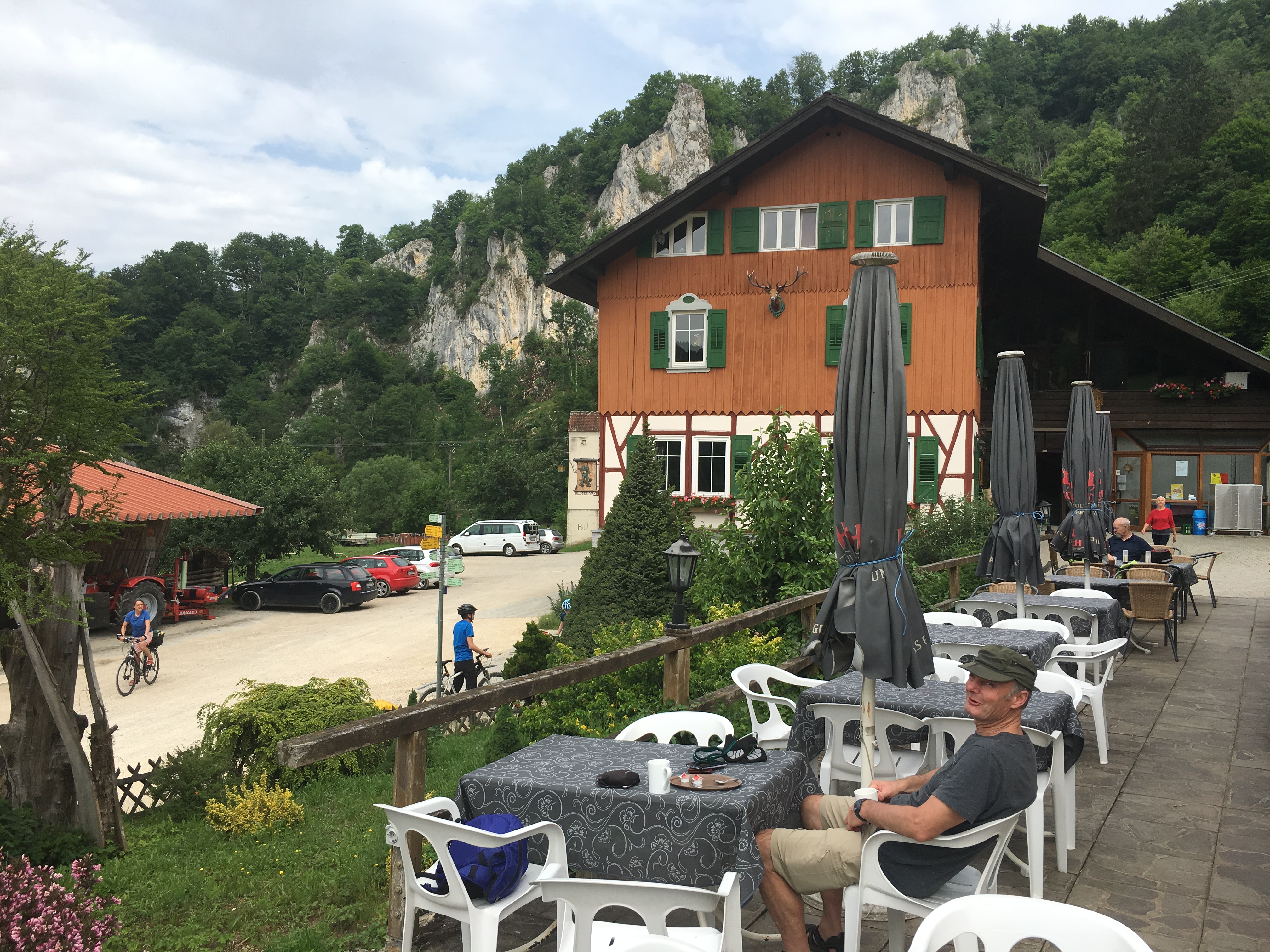 Morning coffee was at a remote hunting lodge and later a (wurst) lunch st a hotel by the bike path. About 7km from Sigmaringen a great thunderstorm caught up with us and after sheltering in a convenient barn for half an hour we put on our wet weather gear and rode on.
