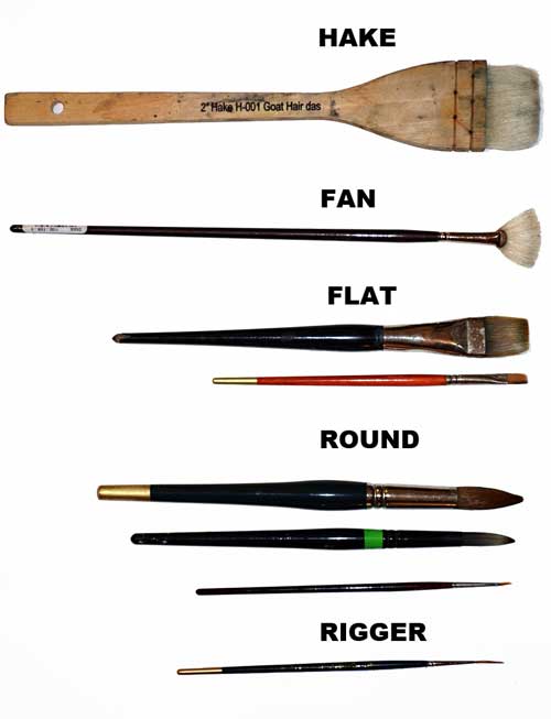 Brushes can use many varieties of hair including sable, squirrel and goat along with a wide variety of synthetic fibres. Generally a good brush should hold plenty of paint (a characteristic of natural fibres) and maintain a fine point or edge (in the case of flat brushes). Sable brushes are generally considered the acme and can cost a lot of money.